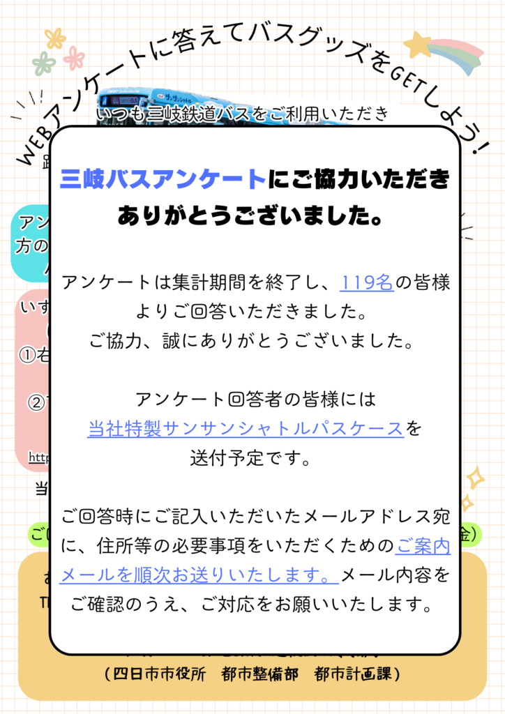昨年末に行いました三岐バスアンケートに、ご協力いただきありがとうございました。